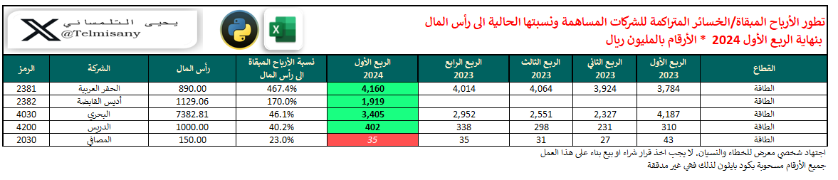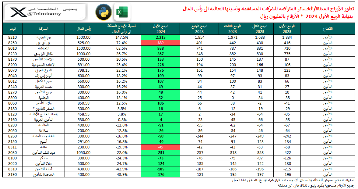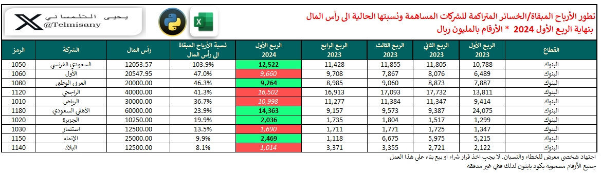 في هذا الثريد نحدث الأرباح المبقاة والخسائر المتراكمة للشركات مع التطور التاريخي لها ونسبتها الحالية إلى رأسمال الشركة بنهاية الربع الأول 2024