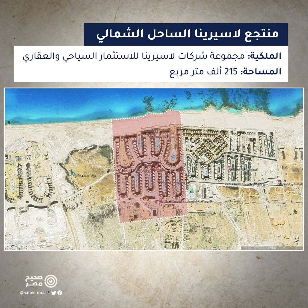 ✅ تقع لاسيرينا الساحل الشمالي عند الكيلو 165، وعلى مساحة 215 ألف متر مربع، مع شاطئ بطول 480 متر، وتعود ملكية الشركة لمجموعة شركات لاسيرينا للاستثمار السياحي والعقاري، ويترأس مجلس إدارتها أحمد عمر، وتمتلك الشركة 12 مشروعًا عقاريًّا حاليًا، منها 6 مشروعات في العين السخنة، و3 مشروعات في رأس سدر، ومشروع في الساحل الشمالي. [23]