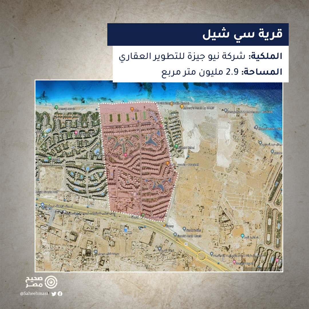 ✅ تقع قرية سي شيل عند الكيلو 134 وعلى مساحة 2.9 مليون متر مربع، وهي مملوكة لشركة نيو جيزة للتطوير العقاري. [25]