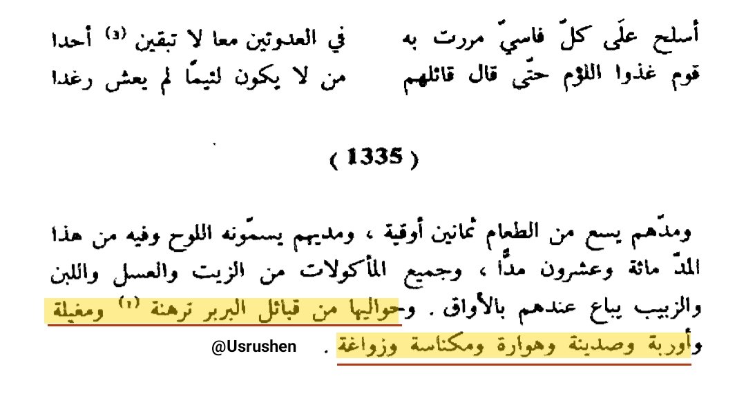 ▪︎و في ذكر ابو عبيد البكري صاحب المسالك و الممالك فإنه يعد #هوارة ضمن القبائل الامازيغية حول فاس فيقول :""و حولها من #قبائل_البربر ترهنة و مغيلة و أوربة و صدينة و #هوارة و مكناسبة و زواغة""!