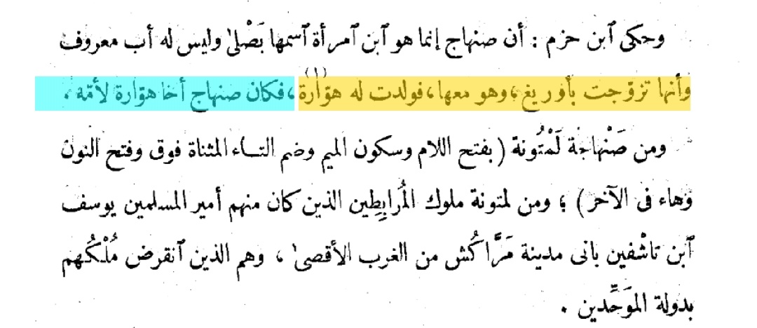 ▪︎☆ثم يذكر صاحب موسوعة صبح الأعشى في صناعة الإنشا المعرزف بالقلقشندي في موضع ذكر القبائل الهوارية في مصر انهم من #البربر رغم ما يدعونه من عروبة هناك فيقول نقلا عن ابن حزم:"" وحكى ابن حزم أن صنهاج إنما هو أبن أمرأة أسمها بصلى وليس له أب معروف وأنها تزوجت بأوريغ، وهو معها ، فولدت له هوارة ، فكان صنهاج أخا #هوارة لأمه""!