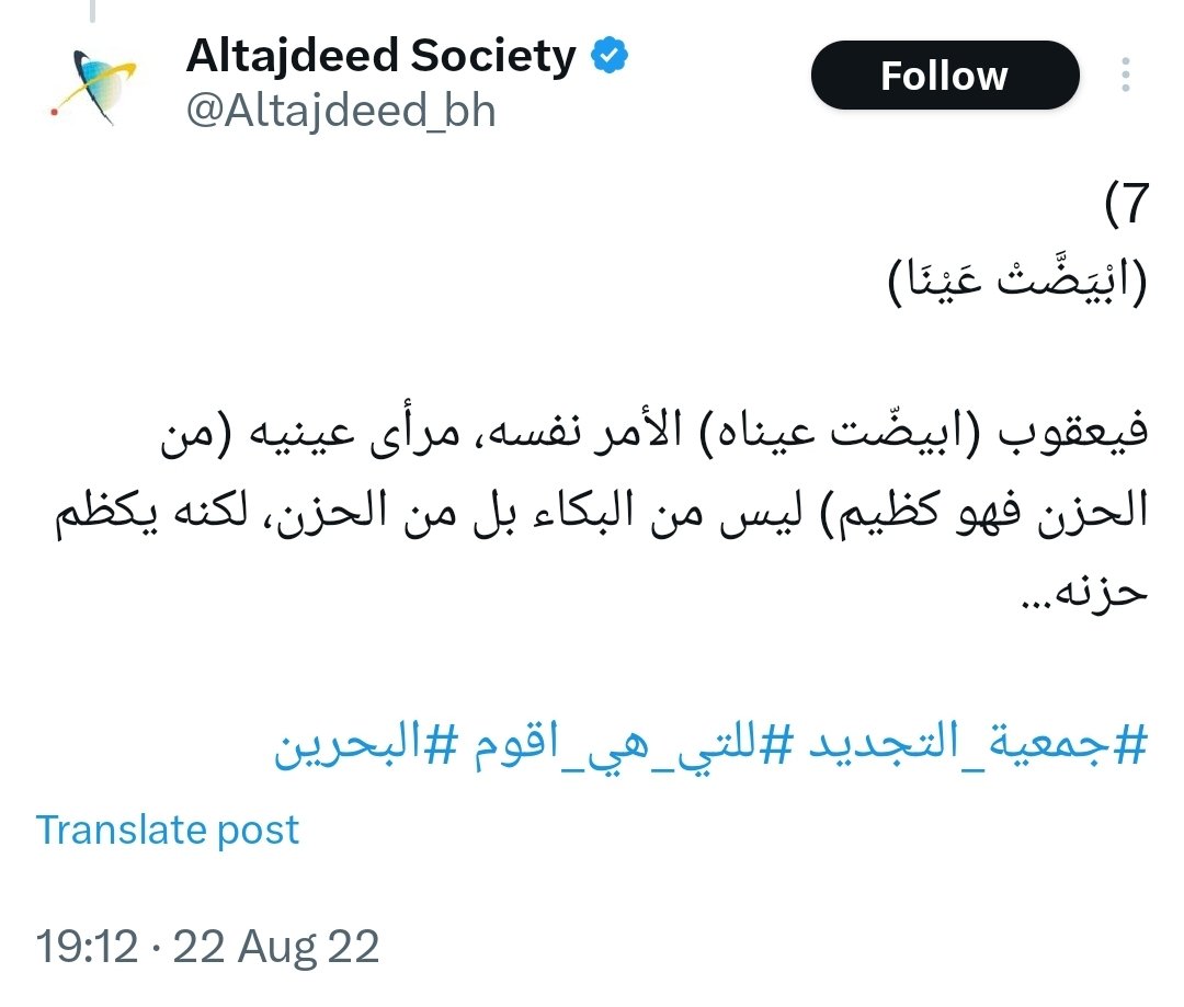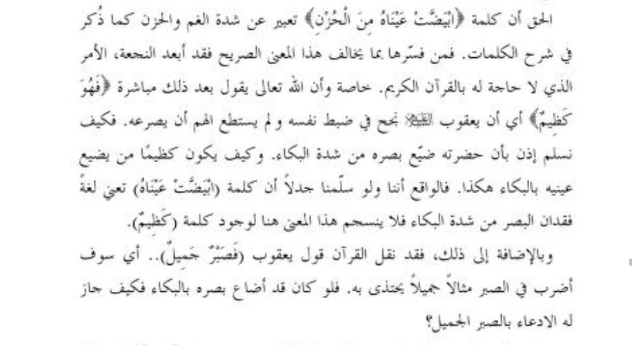 لست في وارد التوغل للرد على تفسيره إلى [وابيضت عيناه] لأن هناك من المفسرين من قال منهم أن العمى قد أصاب يعقوب واحتملوا أيضا أن ضعفا أصاب نظره جراء البكاء لكن جلال يرفض نهائيا أن يكون سبب وابيضت عيناه هو البكاء.