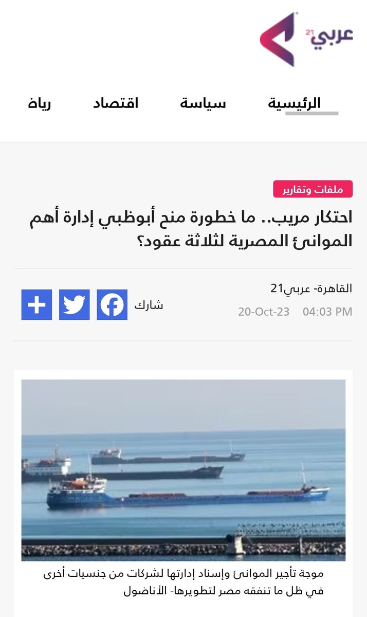 وهو ما وصفه خبراء بأنه تغول ومحاولة للسيطرة من الدولة صاحبة التوجهات التوسعية #الإمارات على قطاع الموانئ الاستراتيجي والحيوي في مصر، وأن ذلك يمثل خطورة كبيرة على أمن مصر القومي، خاصة لما تملكه الإمارات من شراكات وكيانات دولية بينها وبين #إسرائيل . 👇
