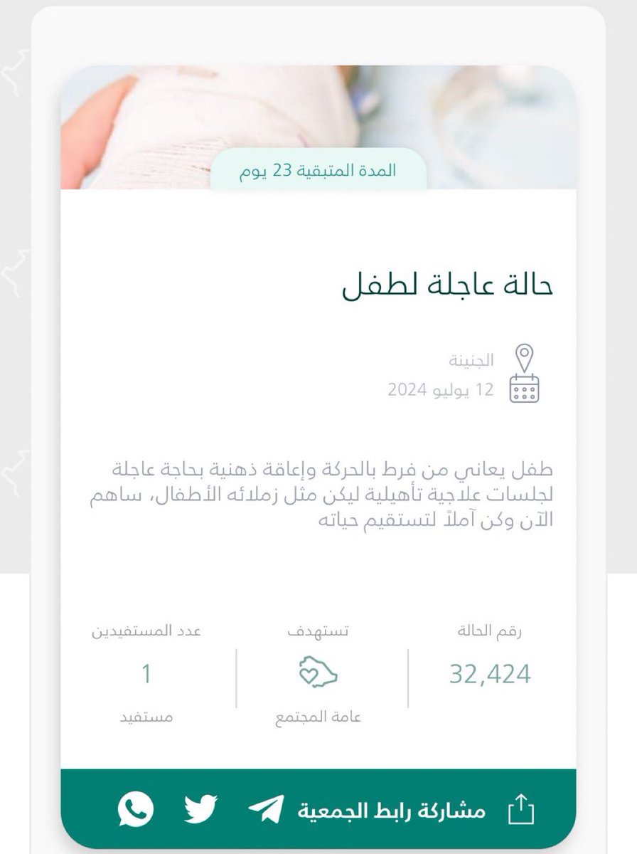 هذي حالة عاجلة وحرجة لطفل يعاني من اعاقة ذهنية، ويحتاج وقفتنا جميعًا لعلاجه وهو في أمس الحاجة، خلونا اليوم نطلعه وهو مبسوط ومتكفلين بعلاجه