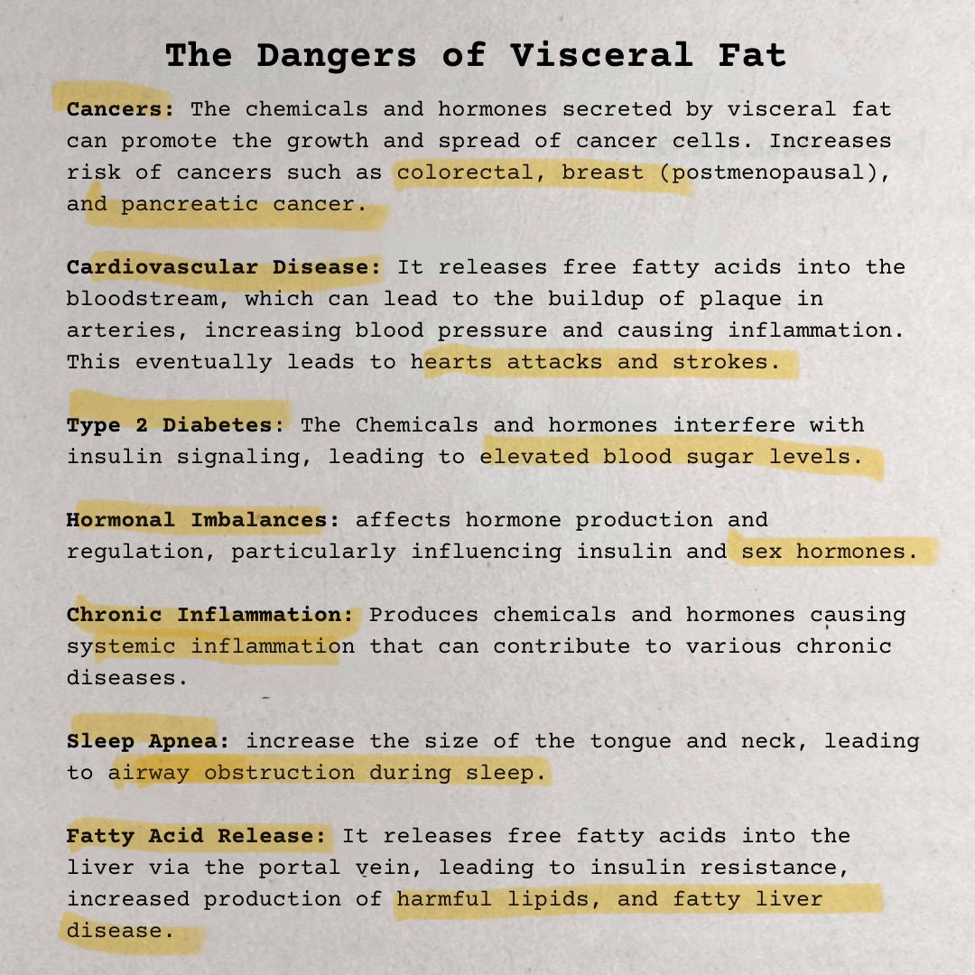 Visceral fat (belly fat) is the fat stored around internal organs in the abdominal cavity, linked to higher risks of heart disease, diabetes, and other serious health conditions