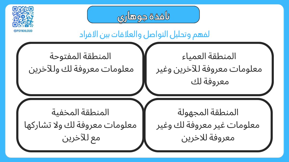 تتكون نافذة جوهاري من أربعة مربعات، كل مربع يمثل منطقة من الوعي الذاتي والتفاعل مع الآخرين:
