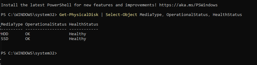Get-PhysicalDisk | Select-Object MediaType, OperationalStatus, HealthStatus