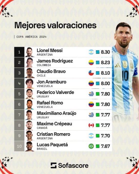 دليل آخر على معاملة الكونميبول التفضيلية تجاه ميسي هو حقيقة أنهم وضعوه كلاعب الأعلى تقييمًا في البطولة على الرغم من تسجيله هدفًا واحدًا فقط، حتى متقدمًا على جيمس رودريجيز الذي حصل على 7 مساهمة