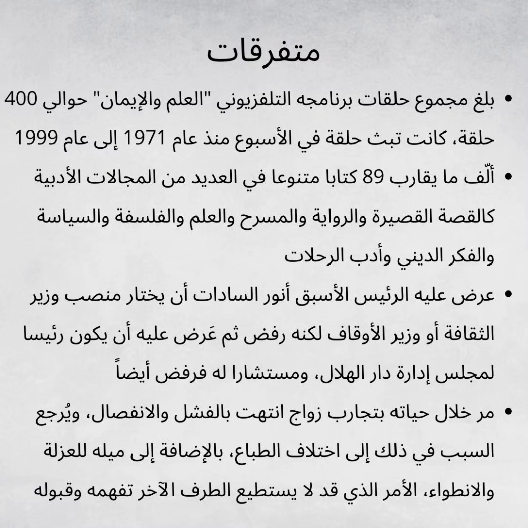 مصطفى محمود، طبيب وأديب وفيلسوف مصري، ظل على مدى نصف قرن ظاهرة فكرية وأدبية تثير الجدل والتفكير والتأمل، وتدعو إلى حوارات في موضوعات مسكوت عنها.