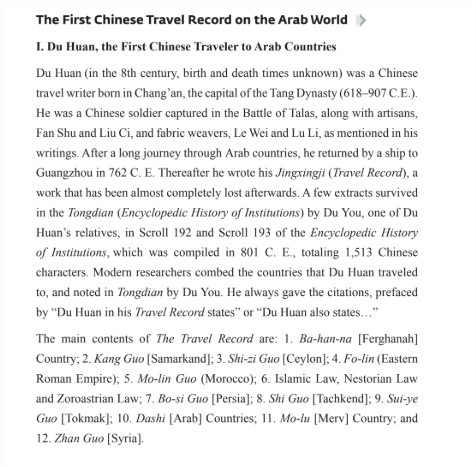 من أسرة تانغ بين عامي 785 و805م. حيث قال: "في أواسط عهد كاي يوان في الأسرة الملكية صوي، كان من القبائل العربية قبيلة قريش، وهي أعظم القبائل، وهي تتفرع إلى بني هاشم وبني أمية، ومن بني هاشم وُلد محمد (صلى الله عليه وسلم)، وهو رجل مقدام حكيم، اتخذه الناس رئيساً لهم".