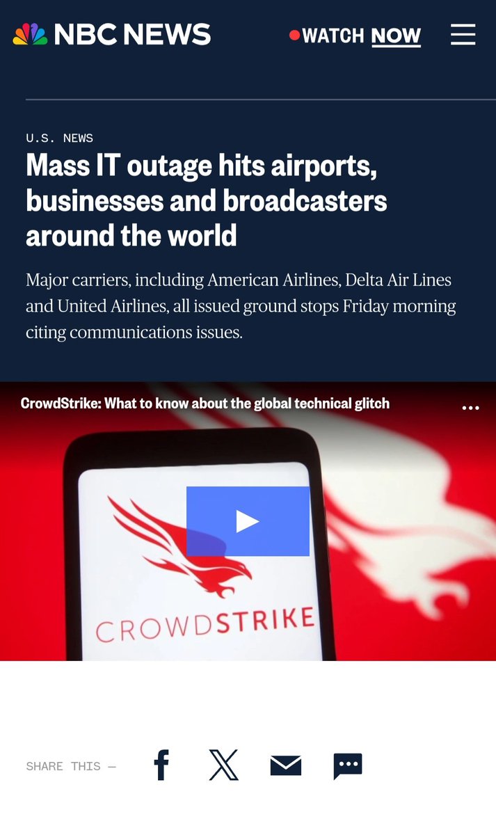 وأصدرت شركات الطيران الكبرى، بما في ذلك الخطوط الجوية الأمريكية ودلتا إيرلاينز ويونايتد إيرلاينز، توقفات أرضية صباح الجمعة بسبب مشاكل في الاتصالات. وتم تعليق الرحلات الجوية في العديد من البلدان وتوقفت المتاجر والقنوات في العديد من البلدان عن العمل.