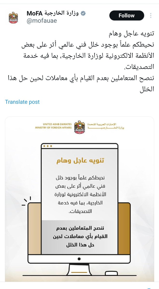 وقد توقفت انظمة المعلومات في العديد من الحكومات حول العالم بسبب خلل مايكروسوفت. منها #وزارة_الخارحية في دولة #الامارات التي تشكرةعلى الشفافية والحرص على خدمات مواطنيها.