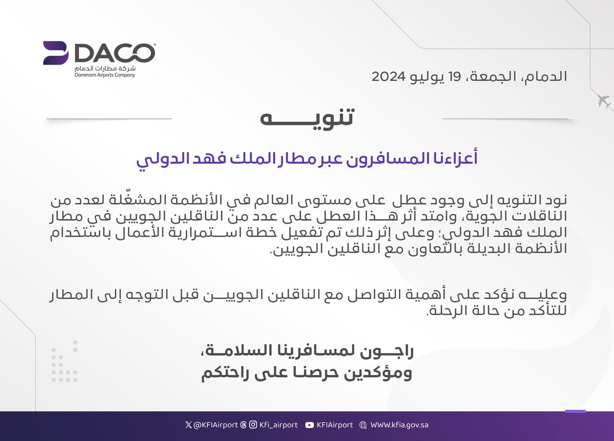 كما اعلنت #المطارات السعودية عن تأثرها بهذا الخلل التقني العالمي وانتشرت مقاطع عبر وسائل التواصل الاجتماعي تكشف تكدس كبير للمسافرين.