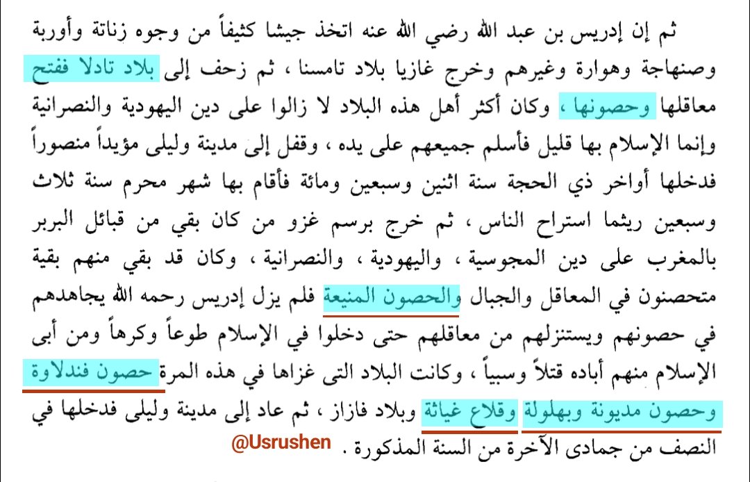 ☆▪︎ #الضربة_الاولى و لنثبت شهادة الخليفة الاموي هشام بن عبد الملك سنستعين بتلك المصادر و الشهادات فيقول الناصري عن غزور إدريس رفقة بقية القبائل الامازيغية للاطلس :""ثم إن إدريس بن عبد الله رضي الله عنه اتخذ #جيشا_كثيفاً من وجوه زناتة وأوربة وصنهاجة وهوارة وغيرهم وخرج غازيا بلاد تامسنا ، ثم زحف إلى بلاد تادلا ففتح معاقلها و #حصونها ، وكان أكثر أهل هذه البلاد لا زالوا على دين اليهودية والنصرانية وإنما الإسلام بها قليل فأسلم جميعهم على يده ، وقفل إلى مدينة وليلي مؤيداً منصوراً فدخلها أواخر ذي الحجة سنة اثنين وسبعين ومائة فأقام بها شهر محرم سنة ثلاث وسبعين ريثما استراح الناس""!!