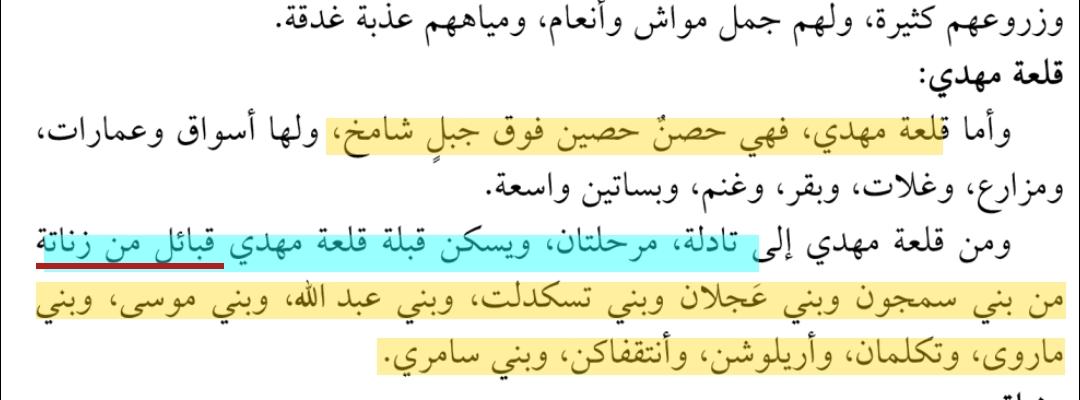 ☆▪︎و كما اوردنا الآن ان بلاد زناتة هي ارض الاطلس المتوسط نعود لصاحب كتاب (نزهة المشتاق، للإدريسي) هيث يؤكد هو الآخر ان #تادلة التي عرفت بالحصون هي ارض زناتة ايضا فيقول :"" ومن قلعة مهدي إلى تادلة مرحلتان ويسكن قبلة قلعة مهدي #قبائل_من_زناتة من بني سمجون وبني عجلان وبني تسكدلت وبني عبد الله، وبني موسى، وبني ماروى، وتكلمان، وأريلوشن، وأنتقفاكن، وبني سامري""!!!