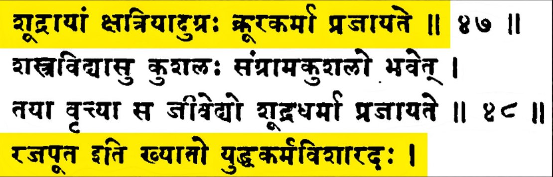 Talking about Sahyadri Khand of Skanda Purana which according to many, mentions Rajputs again a caste of mixed origin, being the son of a Kshatriya father and a Shudra mother.