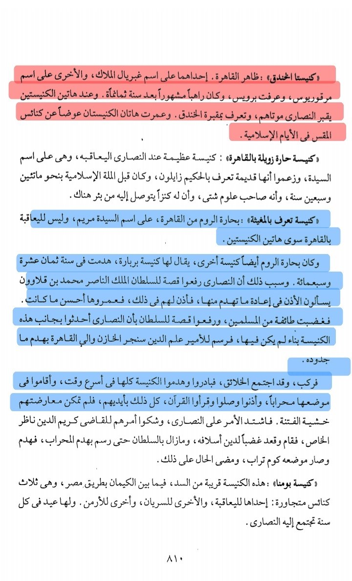 و خد دى ص ٨١٠ المقريزى ذكر كنائس النصارى فى كمية كنايس كثيرة هدمت ، و حديثا حضرتك عندك كنيسة اطفيح اللى اتهدمت من كام سنة و عندك ما يفوق ٧٠ كنيسة احرقت بيد الاخوان ممكن تدور على النت و تعرف 😃، مش عاجبك المقريزى نجيب ابن الحكم مش عاجبك نجيب ابن كثير اهو الاحترام لكل الاديان .