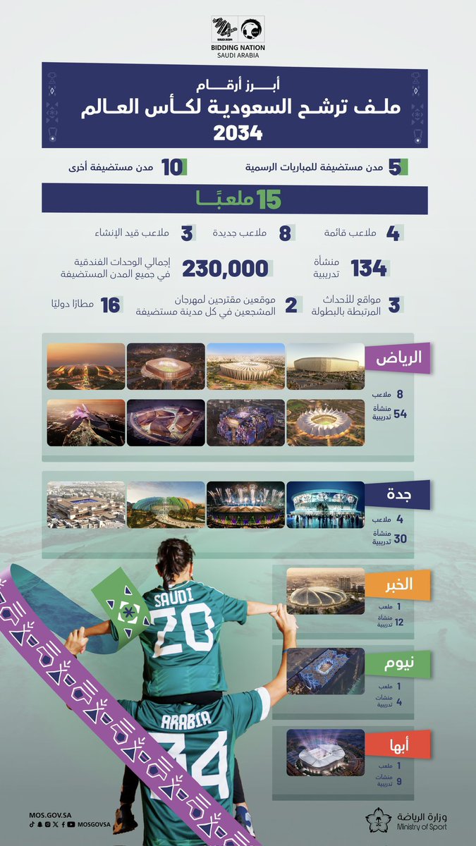 وتؤكد المملكة في ملفها المقدم لـ استضافة كأس العالم 2034م الى اهمية مراعاة موسم الحج ورمضان وان لا تتوافق الاستضافة مع هذي الموسمين