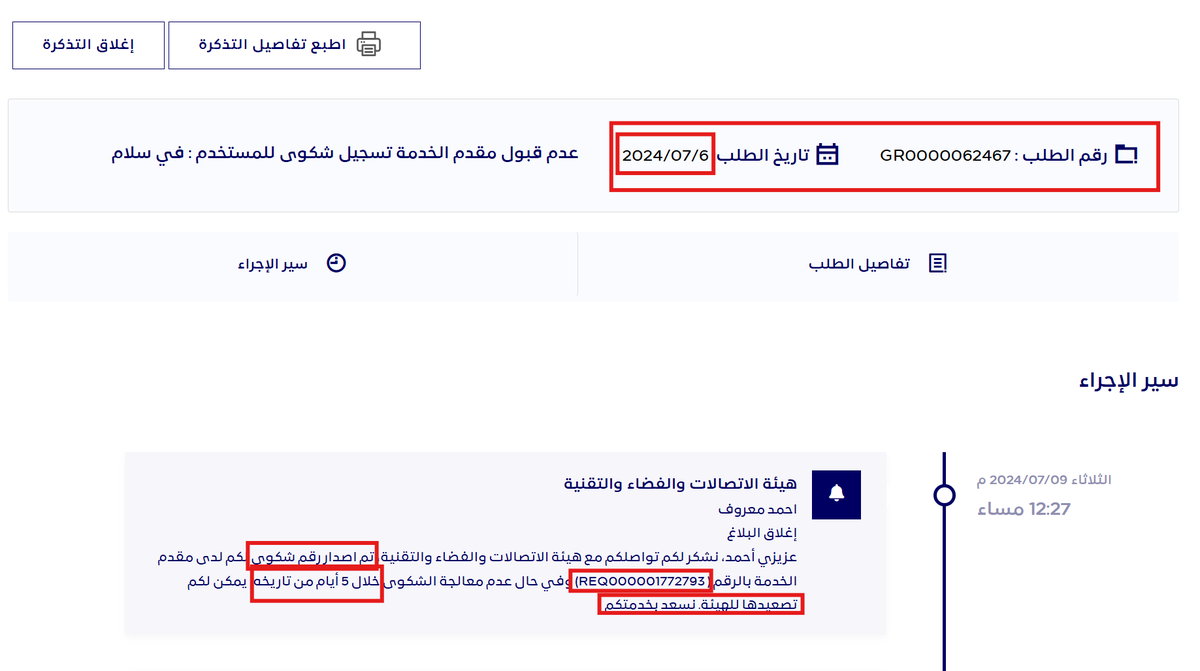 3- تم رفع تذكرة لدى @cstwithu لأن سلام مارضوا يعطوني رقم شكوى ، وهيئة الاتصالات اغلقت البلاغ وزودوني برقم شكوى (REQ000001772793) وان اذا مانحل خلال 5 ايام اقدر اصعده من خلالهم