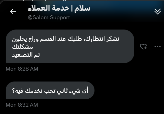 2- بعد 6 ايام تم تأسيس الخدمة وافادتي من قبل دعم سلام بتقديم طلب استرداد للأموال ، .. يتبع