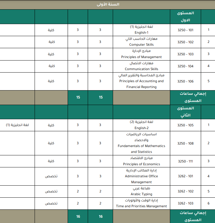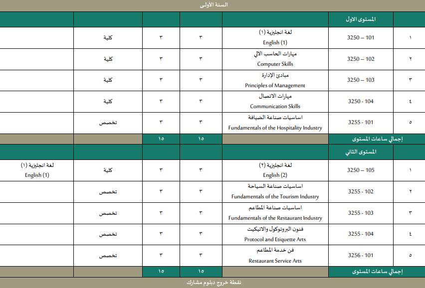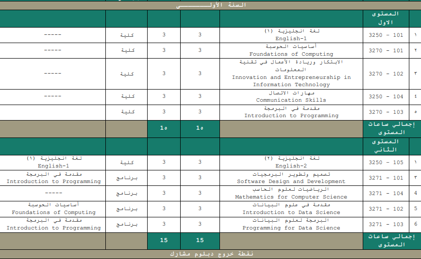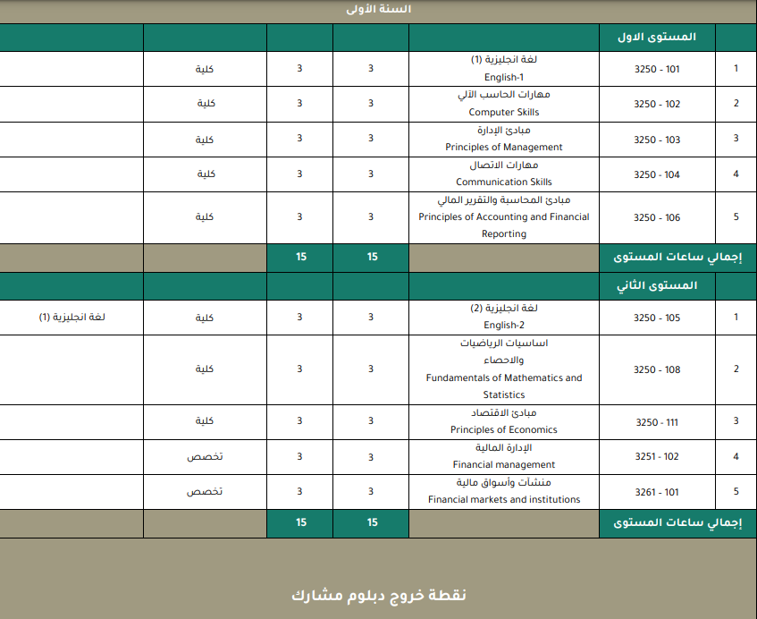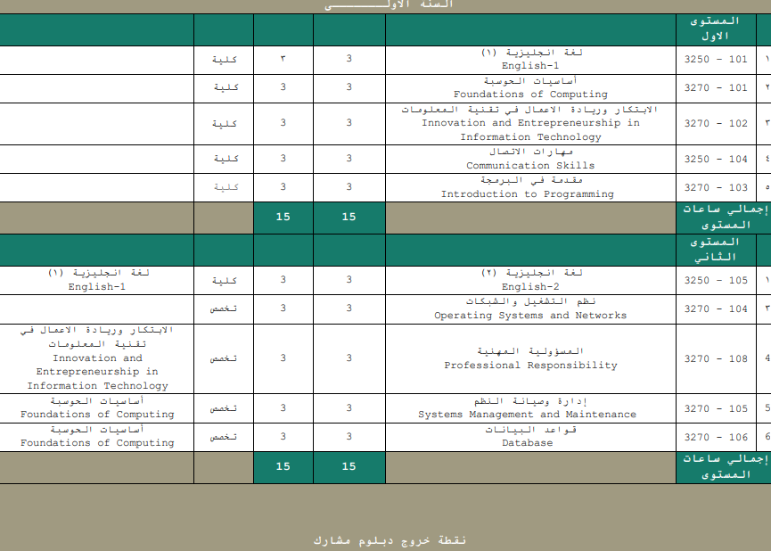 والحين خلونا ناخذ كل تخصص من التخصصات المطروحة ونشوف الشهادة المهنية المرتبطة فيه وخطة أول مستوى "أول فصل دراسي"