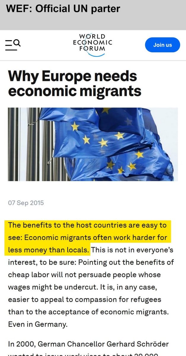 ٥) المنتدى الاقتصادي العالمي (وهو شريك رسمي للأمم المتحدة) يؤكد أن أوروبا "بحاجة" إلى المهاجرين.