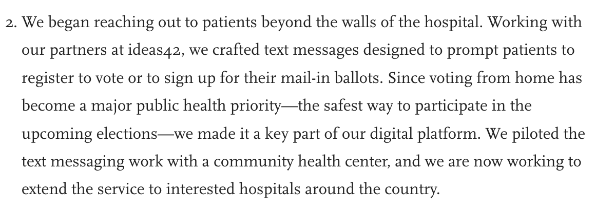 Vot-ER was launched in 2019, a few months before the coronavirus pandemic, at Massachusetts General Hospital. Since then, it has partnered with over 700 health centers, been profiled by the New York Times, and helped more than 89,000 patients vote.