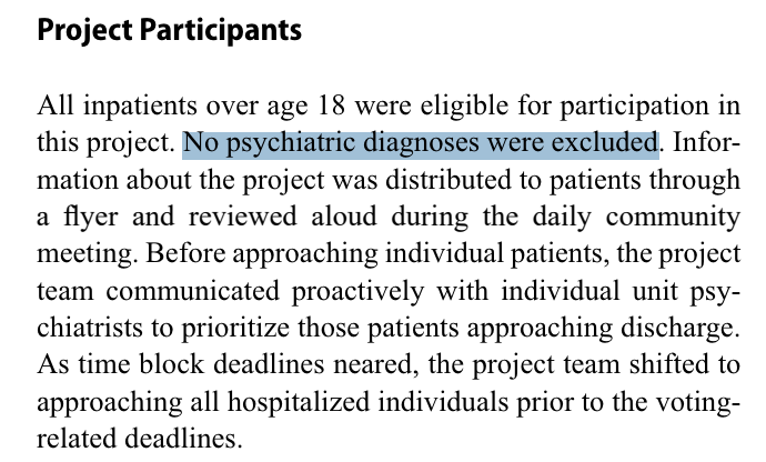 Questions about voting can carry a whiff of extortion in psych wards, Kaminetzky noted, since some patients are involuntarily committed and there against their will: "They may fear that not registering to vote will be seen as non-compliant, necessitating a longer stay."