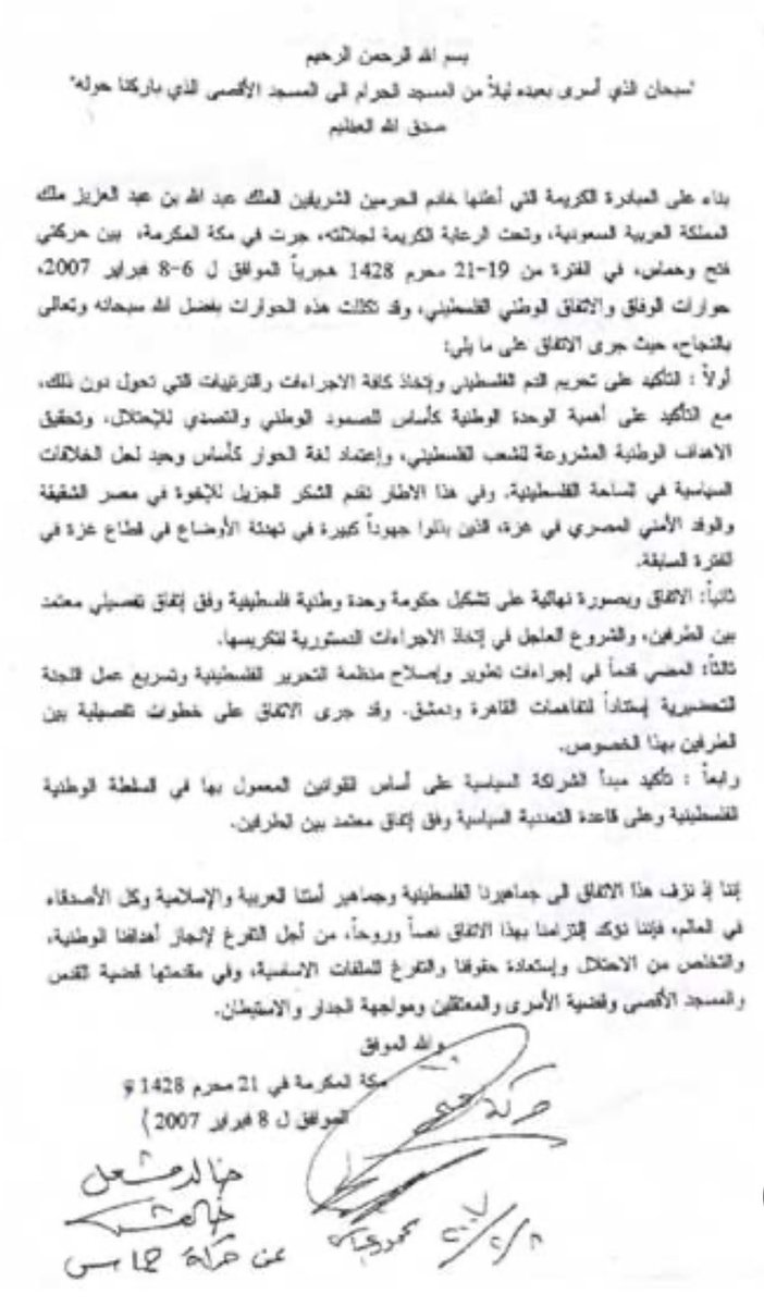 💢 الذي لولا انسحاب حماس منه بقرار من إيران وضغط من قطر ونظام بشار الأسد لكان الوضع الفلسطيني ليس على ما هو عليه الآن ولما كانت هناك ذريعة «التشرذم الفلسطيني» التي يتذرع بها الإسرائيليون والأميركيون وغيرهم لتعطيل العملية السلميّة . وقدأقسموا فيه على حرمة الدماء الفلسطينية وتقديسها وأقروا علي ذلك ، وبعد أقل من 5 أشهر غرقت غزة في شلال من الدماء قتل فيه المئات في الشوارع، وبترت أقدام المئات في أقذر يوم، فقدت فلسطين وحدتها، وقدم لإسرائيل هدية لا تزال تتغنى بها وبفوائدها الاستراتيجية لبقاء كيانها، على الرغم مرور 16 سنة على هذا اليوم الأسود
