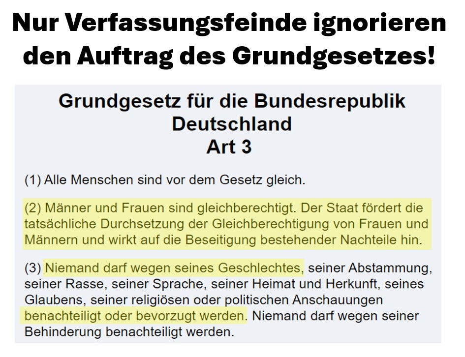 - der Feinde der Gleichberechtigung (führen Genderverbote ein, damit Frauen weniger wahrgenommen werden, obwohl in Art. 3 GG festgehalten ist, dass der Staat alle Hemmnisse der Gleichberechtigung beseitigen muss und kein Geschlecht bevorzugen darf),