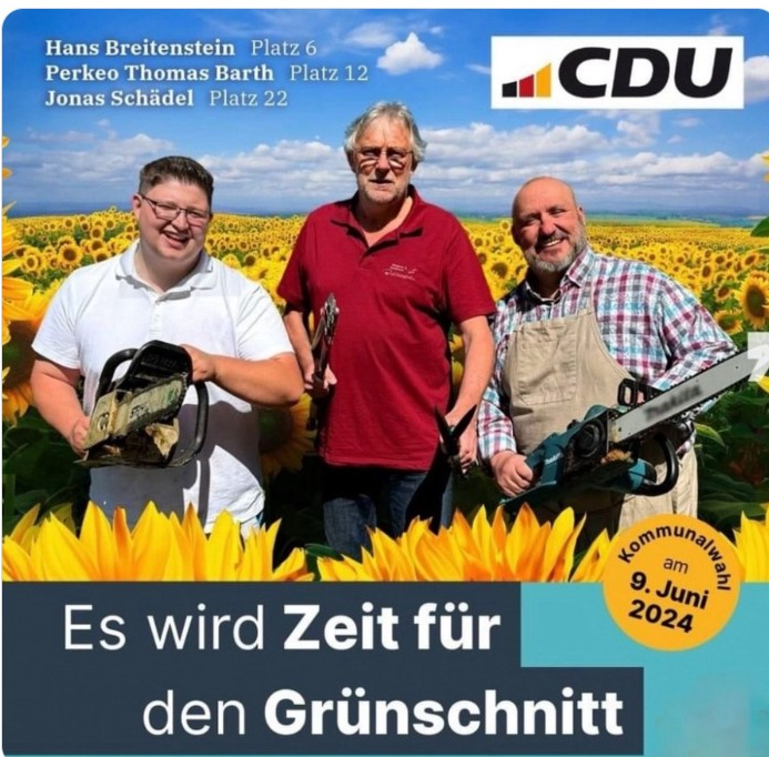 - der Spinner (verbieten in Lübeck das Grillen, und werben dann im Osten damit, dass die CDU die Partei sei, die sich darum kümmere, dass niemand das Grillen verbietet – machen also gegen sich selbst Werbung),