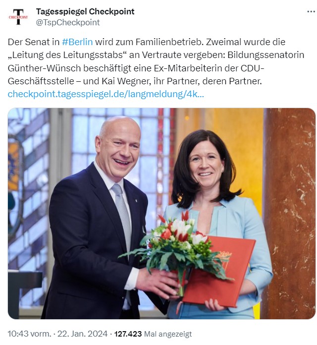 Oh, in Berlin hat sich ja noch jemand aus dem privaten Umfeld gefunden, dem man einen vom Steuerzahler bezahlten Job geben kann.
