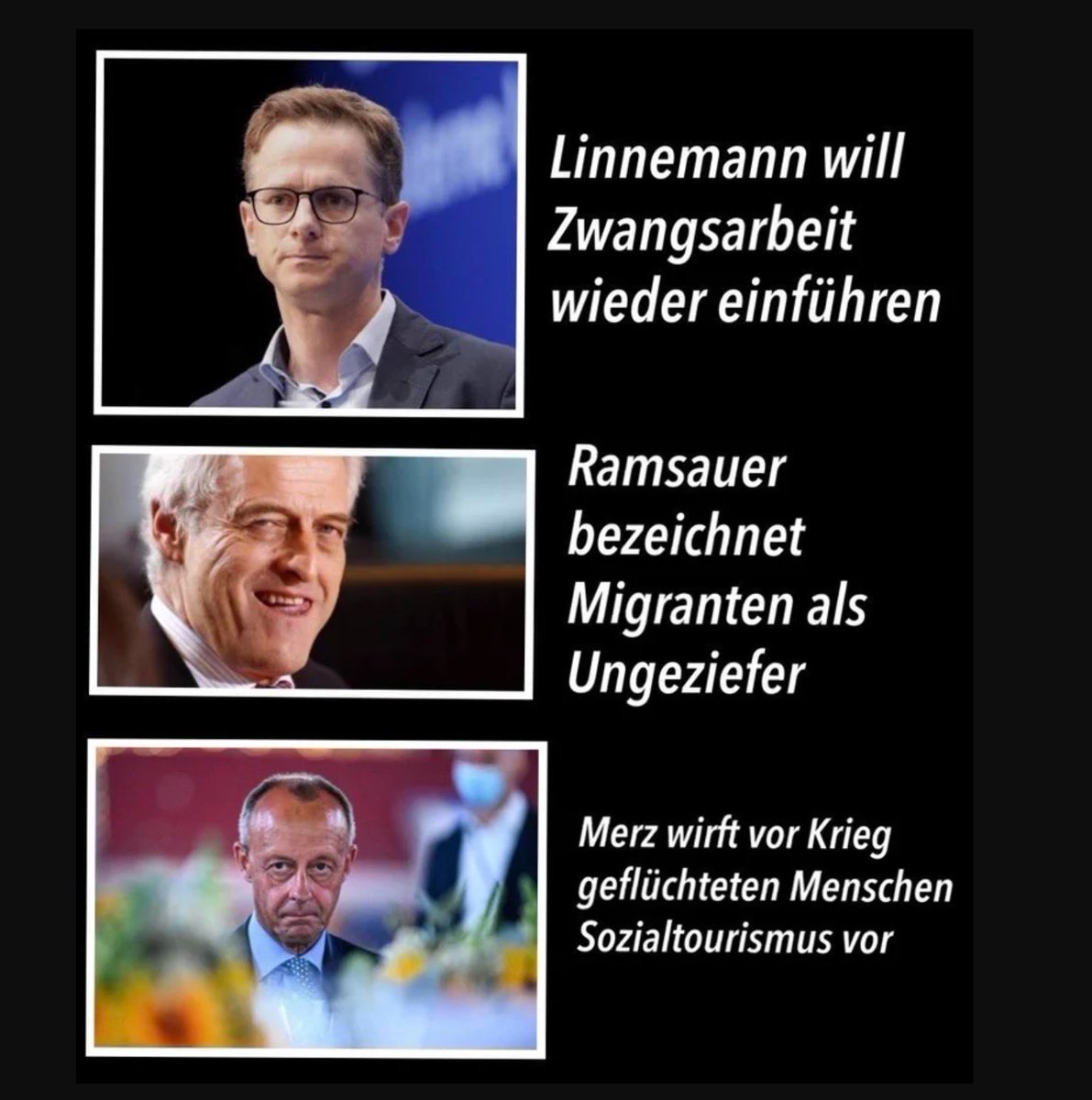 - der verurteilenden Heuchler (Linnemann will vermeintlichen Arbeitsverweigerern das Bürgergeld kürzen, dabei besteht die benannte Zahl nahezu ausschließlich aus jenen stets abwechselnden Personen, die fluktuierend zwischen Bildungsabschluss und Berufsanfang stehen oder zwischen zwei Arbeitsstellen),