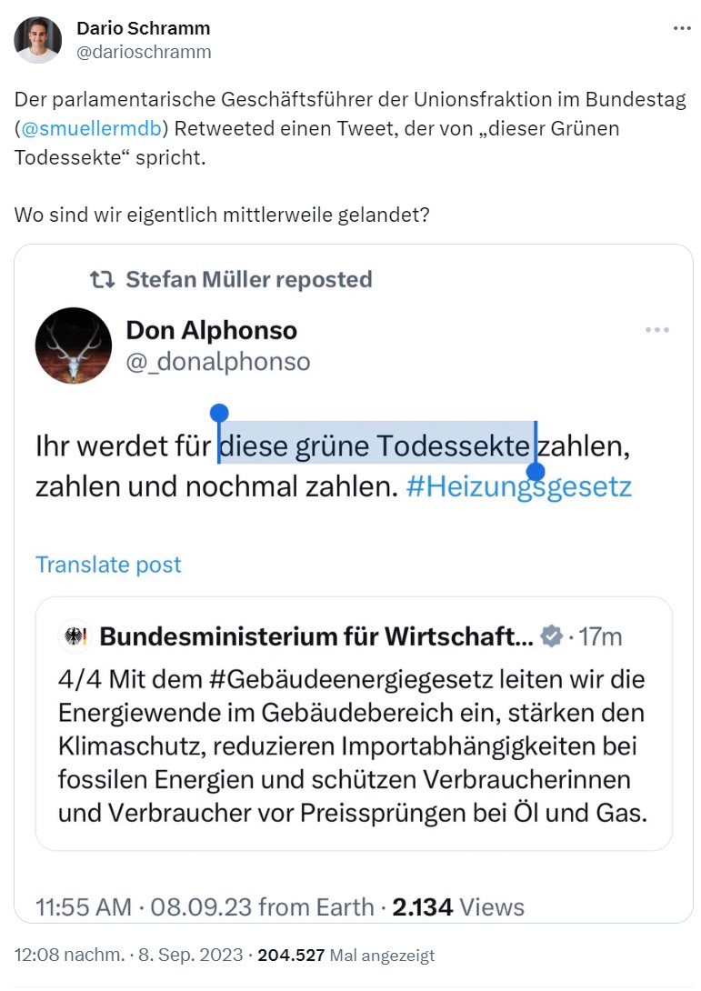 Da macht sich auch mal ein #CDU-Mitglied die Bezeichnung zu eigen, dass die Grünen eine Todessekte seien.