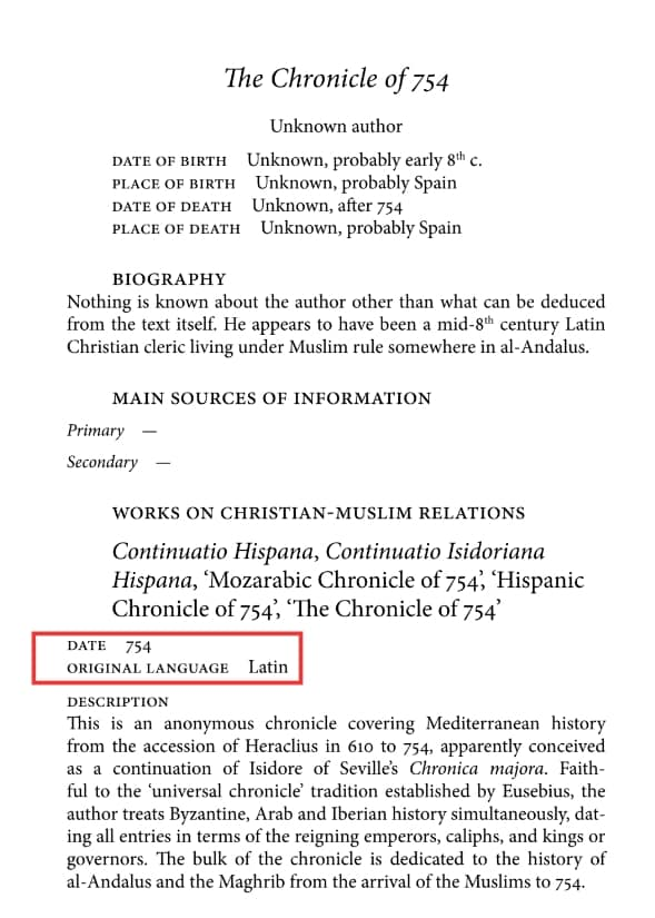 وهذه الحوليات تذكر أحداث فتح الأندلس بقيادة طارق بن زياد وموسى بن نصير، وقد كتبت قبل ان يكتب ابن عبد الحكم المتوفى سنة 870 ميلادي كتابه فتوح افريقيا والأندلس بعقود عدة،