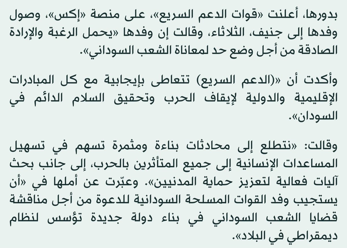 كما توقعنا بالتغريدة أمس حول (السيناريوهين)المتوقعين لمفاوضات جنيف ،أفادت الأنباء وفقا للوكالات والمواقع الإخباريةقبل قليل ،أن المفاوضات ستبدأ اليوم بغياب وفد الحكومة والجيش السودانى، وفد المليشيا المتمردة وصل سويسرا،الجديد اليوم بالموقف الأمريكى،المبعوث الخاص وعراب مفاوضات جنيف، أمهل الوفد الحكومى ثلاثة أيام للحاق بالمفاوضات ،ولم يحدد ماذا يترتب على رفض الوفد المشاركة خلال الثلاثة أيام، صحيفة العرب وصفت الموقف الأمريكى بالمهزوز،وقالت:(تخيير أمريكا لوفد الحكومة والجيش السودانى بين المشاركة والعزلة ،لايرقى للضغوط والتهديد،البرهان يعرف أن أمريكا مشتتة بين عدة قضايا، وليس بمقدورها أن تضغط عليه،وأنها لاتمتلك أساسا أوراق ضغط).