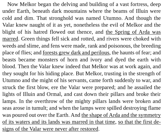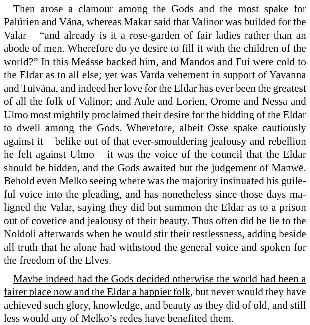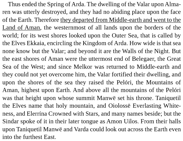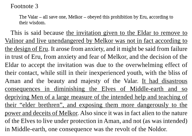But there is another layer to this problem, one that is connected to the idea of ‘fading’. And it is the main reason why the policy of Manwë wins out in the end: ‘Arda marred’, the world wounded by Melkor, takes its toll on the Elves who still live outside of Valionor.