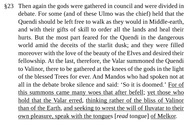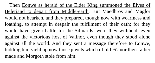His words bear fruit: After the destruction of the Two Trees and the theft of the Silmarills by Melkor, Fëanor incites the other Noldor to ‘return to our home’. And so most of the Noldor leave Valinor and untertake the dangerous journey to Middle-earth.