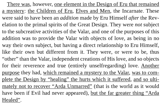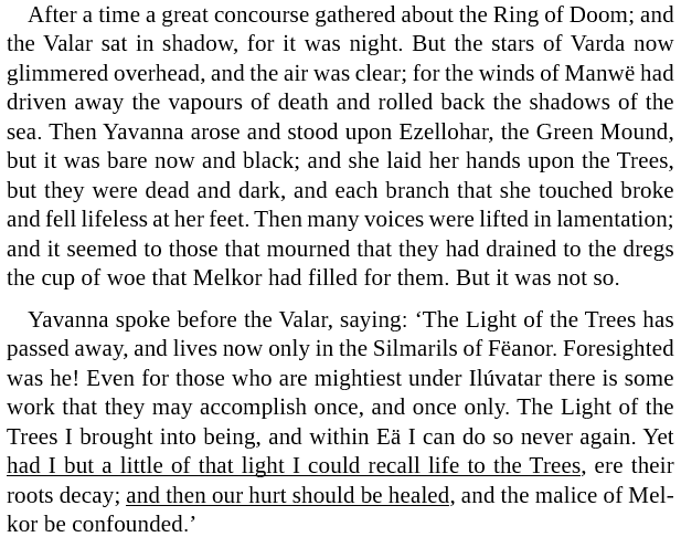 But the healing of the world in both texts is something that could only be archieved with the help of the Creator at the end of the story and not by the children themselves now. And therefore the proper form of ‘hope’ towards such an end is ‘estel’, trust.