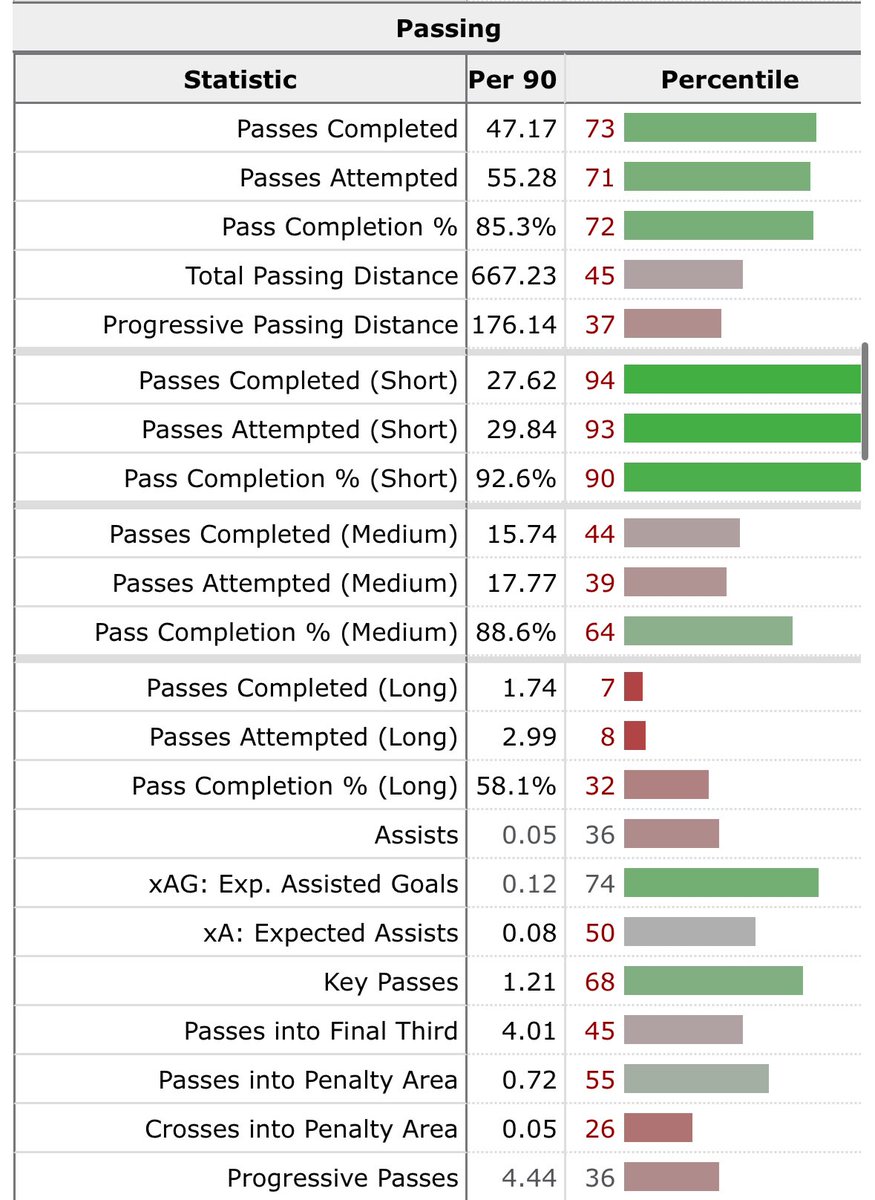 يقوم بتمريرات تقدمية بمعدل 4.92 لكل 90 دقيقة (النسبة المئوية 92) و1.45 جري بالكره (النسبة المئوية 70). قدرته على تحريك الكرة نحو الأمام تضعه بين أفضل اللاعبين في مركزه.