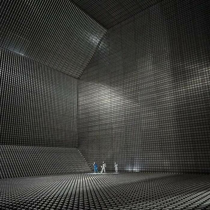 9. Crew members standing inside the cargo tank of an LNG tanker.