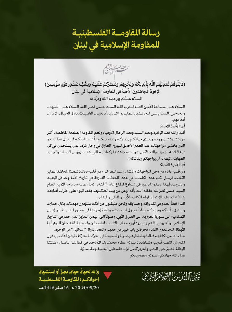 تاأتي هذه الرسالة من "صاحب الشأن الفلسطيني" لتحصين موقف قوى المحور في الرد و ما يلي الرد.