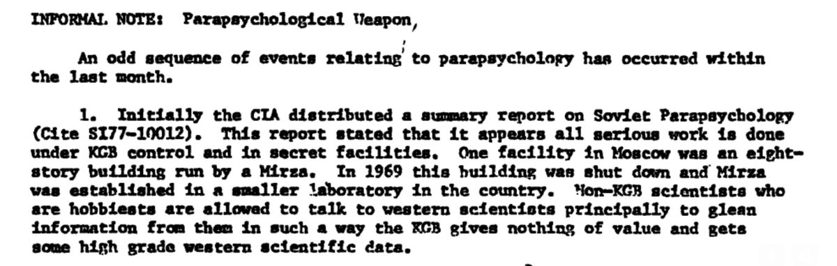في مذكرة من وكالة الأمن القومي تعود إلى عام 1977.إن أول "حدث" أثارته مذكرة وكالة الأمن القومي هو تقرير صادر عن وكالة الاستخبارات المركزية الأميركية ذكرت أبحاث الاستخبارات السوفييتية في مجال علم النفس الخارق.