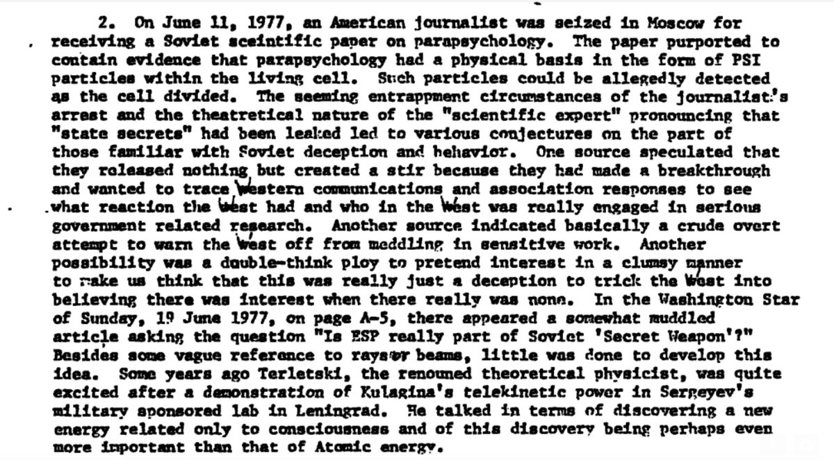 كان الحدث التالي الذي وصفته مذكرة وكالة الأمن القومي ما بدا وكأنه استفزاز روسي، ففي يونيو/حزيران 1977، اعتُقِل صحفي أميركي في روسيا لتلقيه ورقة سوفييتية عن علم النفس الخارق. ويُزعم أن الورقة وثقت وجود جسيمات "نفسية" داخل الخلية الحية، مما يوفر أساساً مادياً لعلم النفس الخارق.