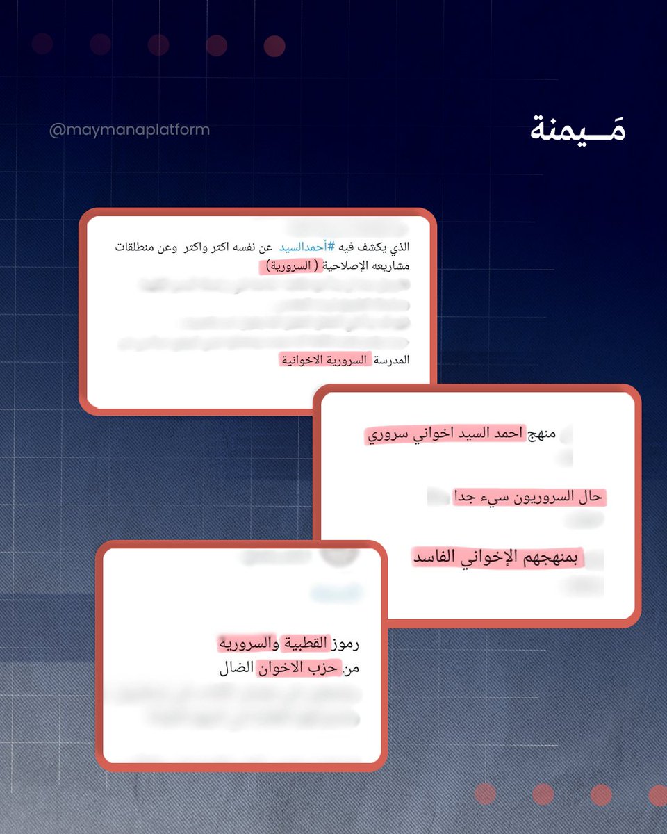 مشروع #أحمد_السيد كما يجد المتفحص لمفرداته وبرامجه؛ يستمد مضامينه من الوحي، يربط الناس بقدواتهم من الأنبياء والمرسلين ثم بخير القرون صحابة رسول الله رضوان الله عليهم، لا يربطهم بحزب أو حركة معينة، بل يصرّح بموقفه من الأحزاب المخالفة لمنهج الوحي ويغرس في برامجه التحاكم إلا الوحي لا الأفراد والجماعات، فرسالة المشروع أكبر مما يحجّمها ويؤطرها به المخالفون.