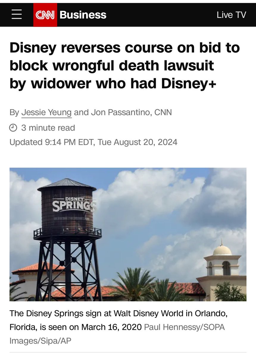 Disney reverses course on bid to block wrongful death lawsuit by widower who had Disney+ | CNN Business
