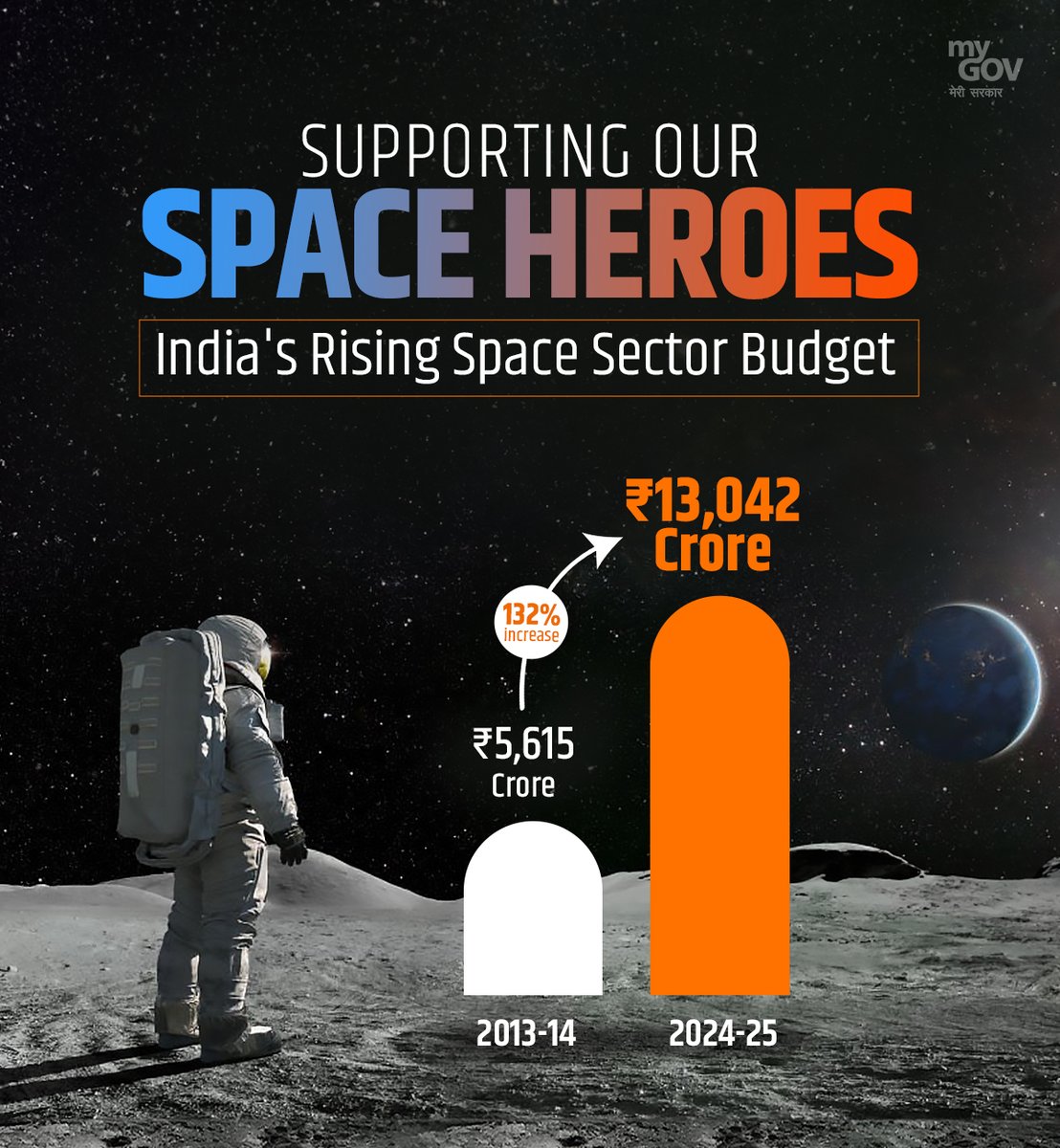 India’s commitment to space exploration is stronger than ever with a 132% increase in the space sector budget. This boost will empower ISRO to continue pioneering new missions and support our space heroes in their quest for innovation.