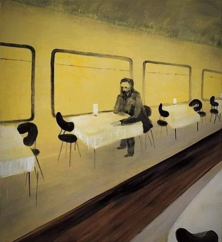 ويستمتعون بالجلوس والأكل ويتحسر في نفسه على عدم تمكنه أن يفعل مثلهم وأن إمكانياته لا تتيح له أن يستمتع كما يستمتعون