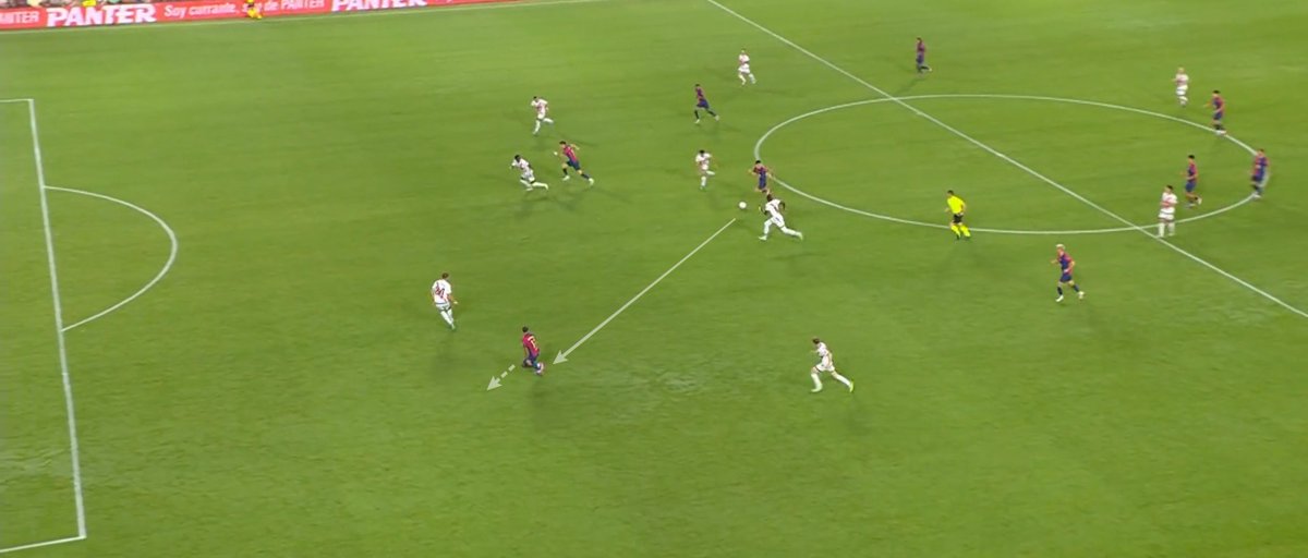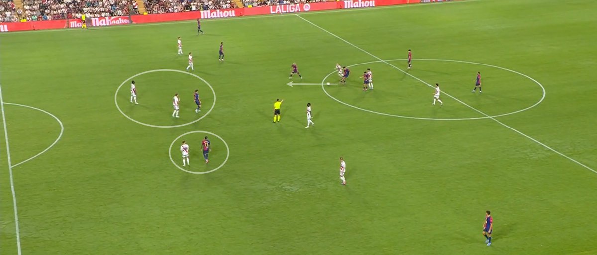 En una de estas situaciones mal ajustadas, llegó el gol de Unai López. Giro de juego de Mumin sobre Balliu, que conecta genial de primeras con De Frutos. Gerard salta a Balliu, teniendo marca. Error. Y Koundé no está coordinado con la línea. Tampoco Ferran reajustó posición