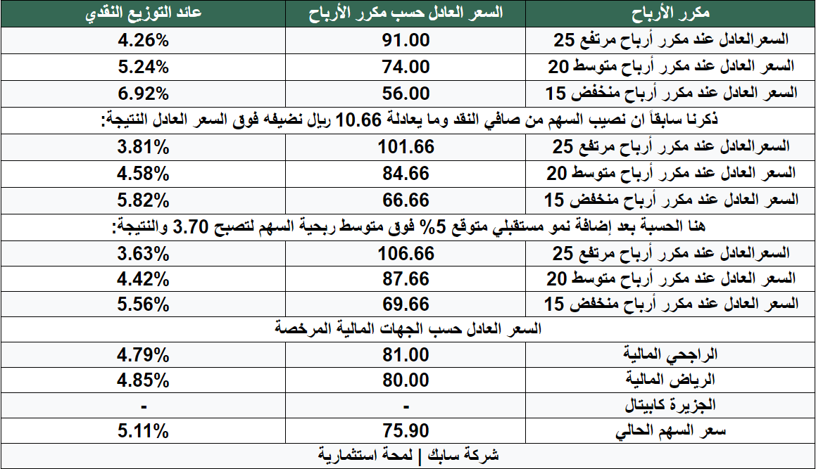 2- تم إضافة 10.66 ريال الـ 10.66 ريال جات من المركز المالي للشركة لو تذكرون ذكرنا ان نصيب السهم 10.66 ريال بأختصار تم إضافتها فوق التقييم بناء على متوسط مكرر الربحية والنتيجة 84.66 ريال.